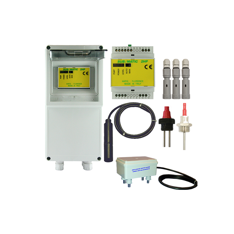 Kit interruttore a galleggiante modello Sub/Matic S per pompe fino a 2 HP, completo di sonde di livello. Controlla automaticamente il livello dell'acqua in serbatoi e vasche.