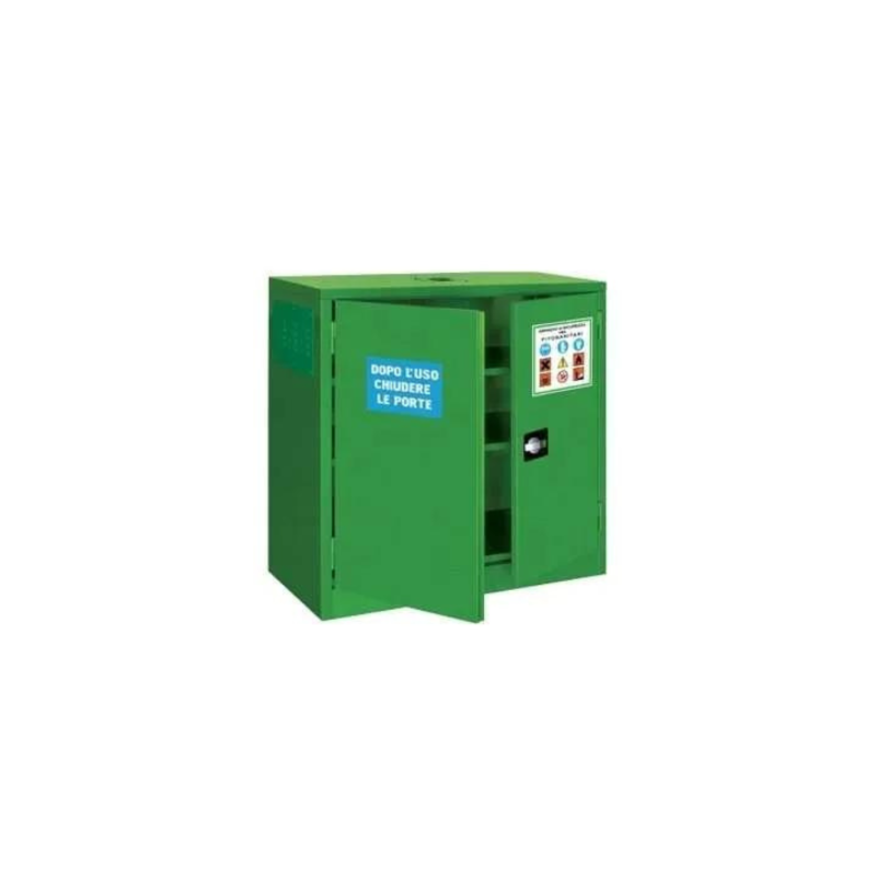 Armadio monoblocco in lamiera d'acciaio verniciato verde per lo stoccaggio di prodotti fitosanitari (pesticidi, erbicidi, fungicidi), dimensioni 1000x460x1000 mm con 2 ante. Conforme alla normativa che impone la custodia dei fitosanitari in armadi chiusi a chiave, separati da alimenti e mangimi.