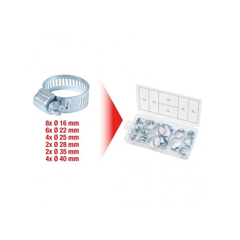 Valigetta con 26 fascette stringitubo in misure da 16 a 40 mm per manutenzione di impianti idraulici e pneumatici.