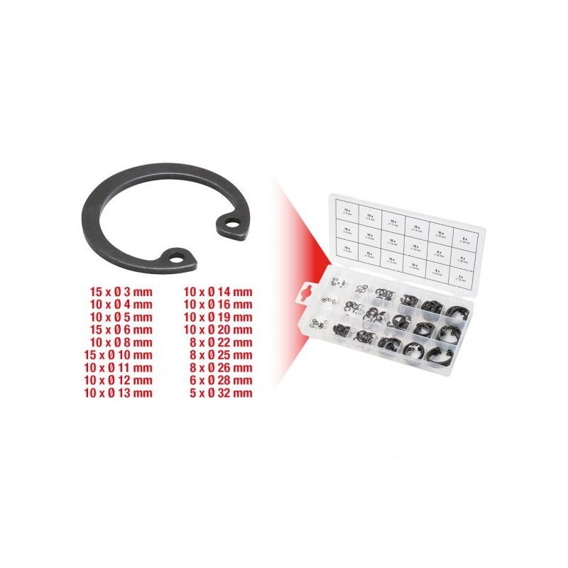 Valigetta con 180 anelli elastici per fori (interni) in misure da 14 a 32 mm, per il bloccaggio assiale di componenti in alloggiamenti.