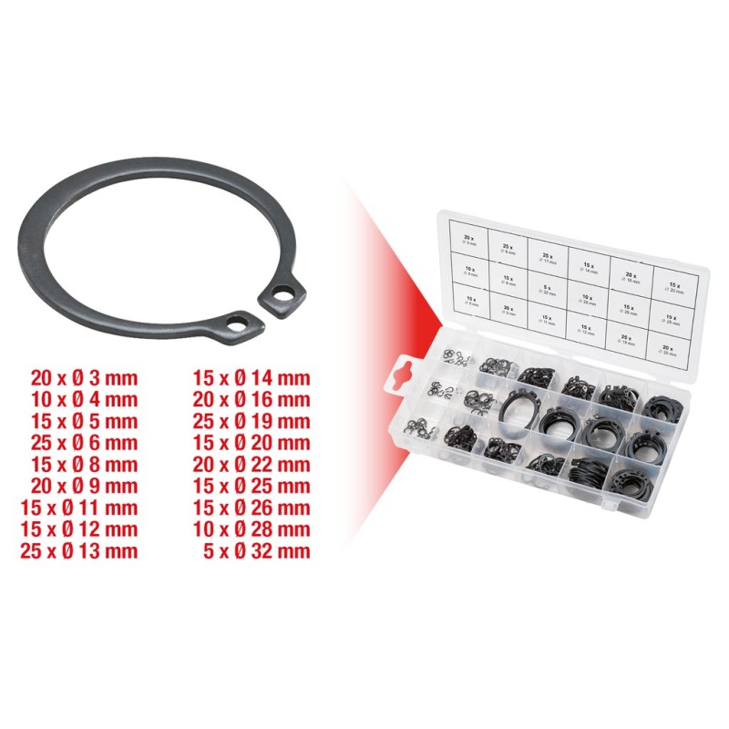 Valigetta con 300 anelli elastici per alberi (esterni) da 14 a 32 mm.