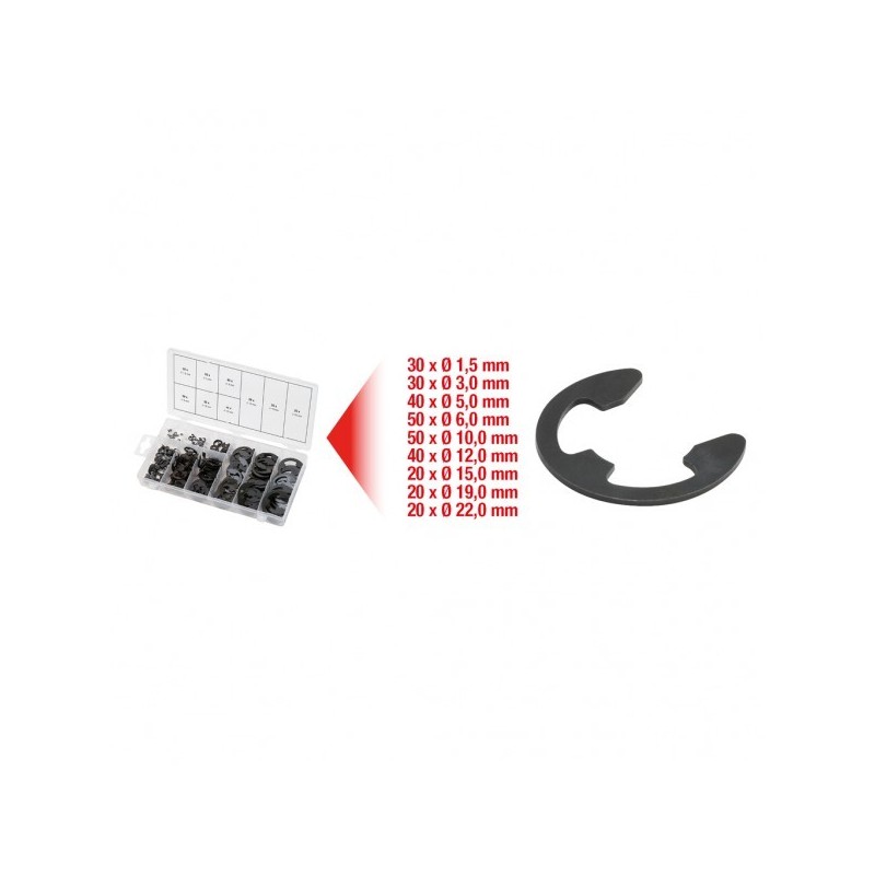 Valigetta con 300 anelli elastici radiali (E-clip) da 1,5 a 22 mm per bloccaggio rapido su perni.