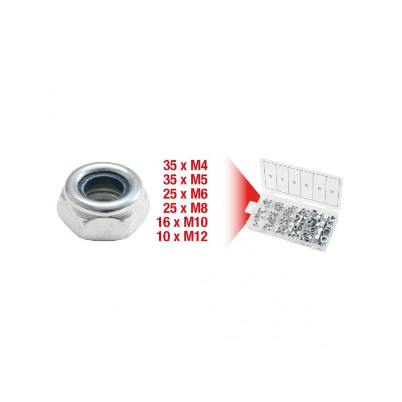 Valigetta con 146 dadi autobloccanti con inserto in nylon, misure da M4 a M12.