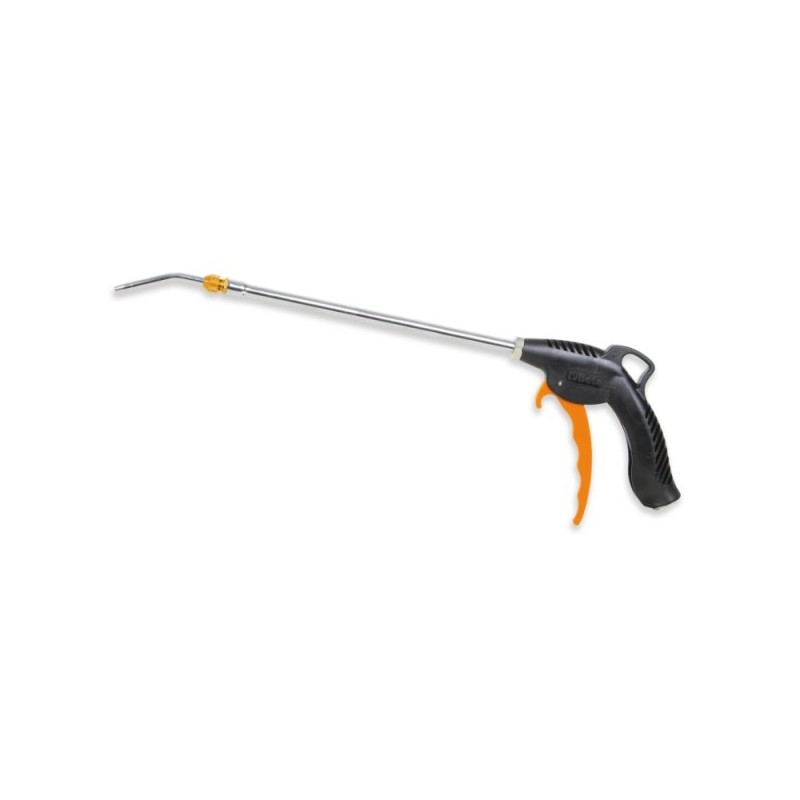 Pistola di soffiaggio professionale Beta per la pulizia con aria compressa di componenti, macchinari e postazioni di lavoro. Ugello in alluminio o acciaio con leva di azionamento progressivo per regolazione del flusso. Attacco rapido per collegamento alla rete dell'aria compressa.