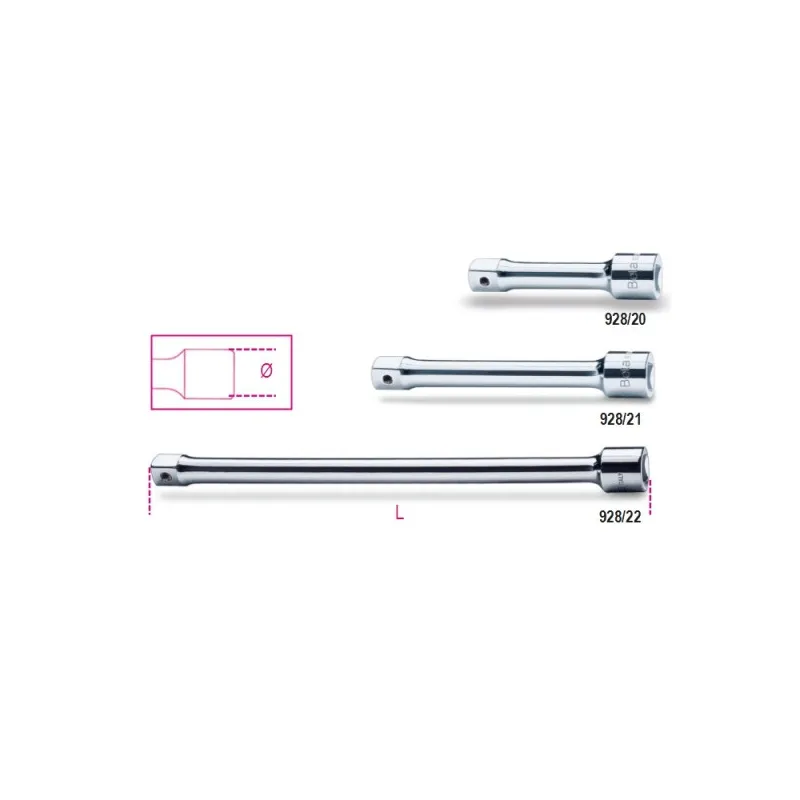 Prolunga (estensione) professionale Beta per chiavi a bussola e cricchetti, che consente di raggiungere dadi e bulloni in posizioni profonde o incassate. Corpo in acciaio al cromo-vanadio con finitura cromata e perno di ritenzione a molla. Disponibile con attacco quadro da 1/4", 3/8", 1/2", 3/4" o 1" in diverse lunghezze.