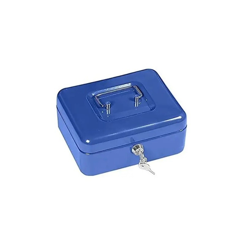 Cassette portavalori (cash box) in metallo verniciato marca Domus con serratura a chiave e vassoio interno portamonete estraibile. Struttura compatta e maneggevole per la custodia e il trasporto di contanti, assegni e piccoli valori.