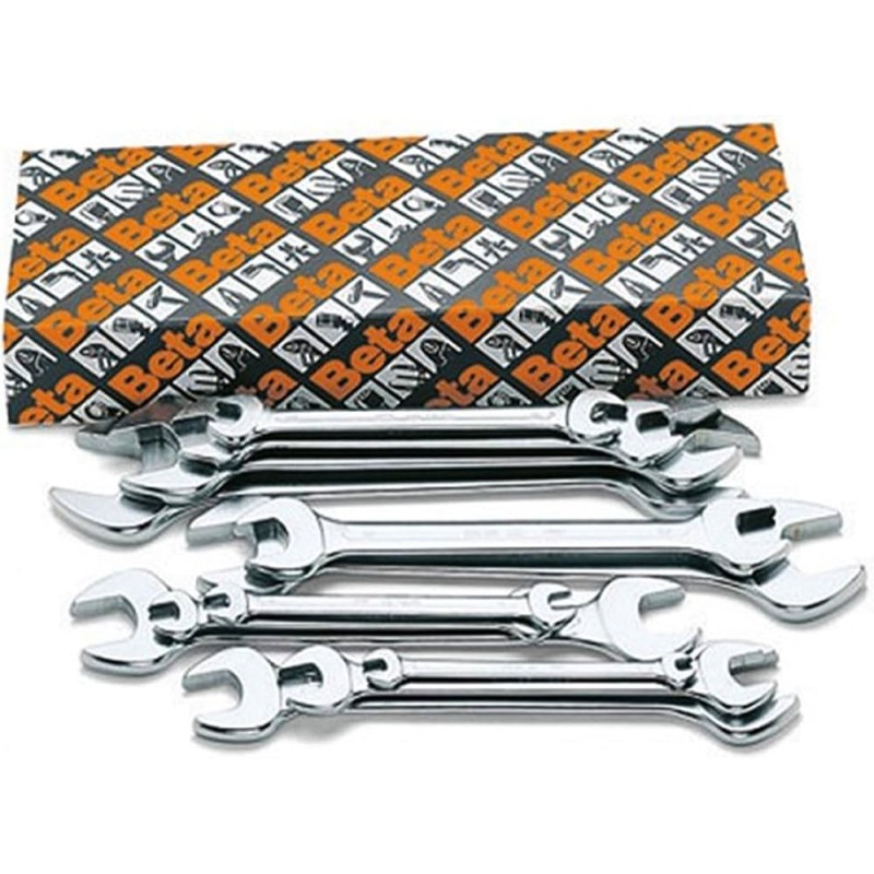 Serie assortita di chiavi professionali Beta, fornita in supporto compatto o astuccio per trasporto e organizzazione. Ogni chiave è realizzata in acciaio al cromo-vanadio forgiato e temperato con finitura cromata per resistenza alla corrosione. La serie include le misure più comuni per coprire le principali esigenze di serraggio in officina.