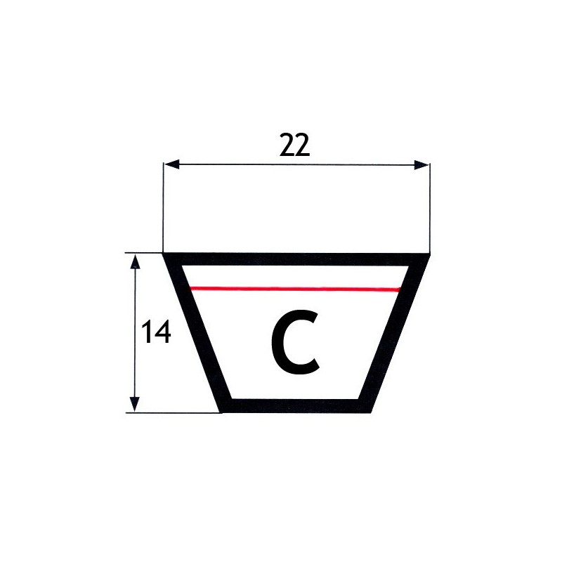 Profilo e dimensioni: sezione C con larghezza dorsale ≈ 22 mm e altezza ≈ 14 mm, tipico delle cinghie C‑section.