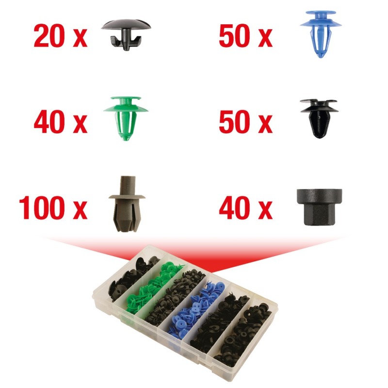 Assortimento professionale di clips in plastica KS Tools, specificamente selezionato per veicoli OPEL, VAUXHALL, composto da 300 pezzi in diverse misure e tipologie. Le clips sono progettate per garantire la perfetta compatibilità con i sistemi di fissaggio originali del costruttore, assicurando un montaggio preciso e una tenuta affidabile nel tempo. Realizzate in materiale plastico di alta qualità, resistente a vibrazioni, agenti atmosferici e sbalzi termici, queste clips sono ideali per le operazioni di manutenzione, riparazione e ripristino dei rivestimenti della carrozzeria. Il kit è fornito in una pratica valigetta con scomparti organizzati. KS Tools è un'azienda tedesca fondata nel 1992, specializzata nella produzione di utensili professionali e accessori per il settore automotive. Con oltre 32.000 articoli a catalogo, KS Tools offre assortimenti specifici per marca di veicolo, garantendo la compatibilità con i sistemi di fissaggio originali.