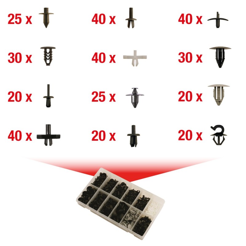 Assortimento professionale di clips in plastica KS Tools, specificamente selezionato per veicoli VOLVO, composto da 420 pezzi in diverse misure e tipologie. Le clips sono progettate per garantire la perfetta compatibilità con i sistemi di fissaggio originali del costruttore, assicurando un montaggio preciso e una tenuta affidabile nel tempo. Realizzate in materiale plastico di alta qualità, resistente a vibrazioni, agenti atmosferici e sbalzi termici, queste clips sono ideali per le operazioni di manutenzione, riparazione e ripristino dei rivestimenti della carrozzeria. Il kit è fornito in una pratica valigetta con scomparti organizzati. KS Tools è un'azienda tedesca fondata nel 1992, specializzata nella produzione di utensili professionali e accessori per il settore automotive. Con oltre 32.000 articoli a catalogo, KS Tools offre assortimenti specifici per marca di veicolo, garantendo la compatibilità con i sistemi di fissaggio originali.