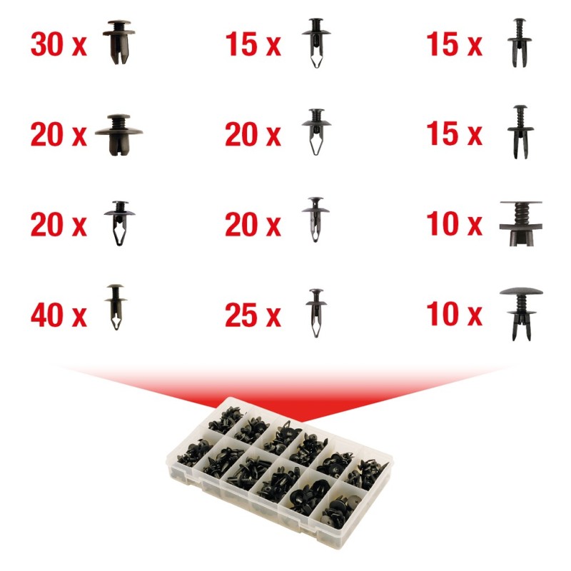 Assortimento professionale di clips universali in plastica KS Tools, composto da 240 pezzi in diverse misure e tipologie. Il kit è progettato per offrire una soluzione completa per le operazioni di manutenzione e riparazione della carrozzeria su un'ampia gamma di veicoli. Le clips sono realizzate in materiale plastico di alta qualità, resistente alle vibrazioni, agli agenti atmosferici e alle escursioni termiche tipiche dell'ambiente automotive. L'assortimento è fornito in una pratica valigetta con scomparti organizzati per tipologia, facilitando l'identificazione rapida del pezzo necessario durante le operazioni in officina. KS Tools è un'azienda tedesca fondata nel 1992, specializzata nella produzione di utensili professionali e accessori per il settore automotive. Con oltre 32.000 articoli a catalogo, KS Tools offre assortimenti specifici per marca di veicolo, garantendo la compatibilità con i sistemi di fissaggio originali.