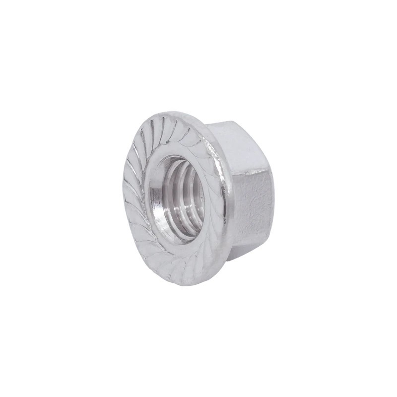 Dadi flangiati con base zigrinata integrata che elimina la necessità di una rondella separata. La flangia zigrinata morde la superficie di appoggio, aumentando la resistenza allo svitamento.