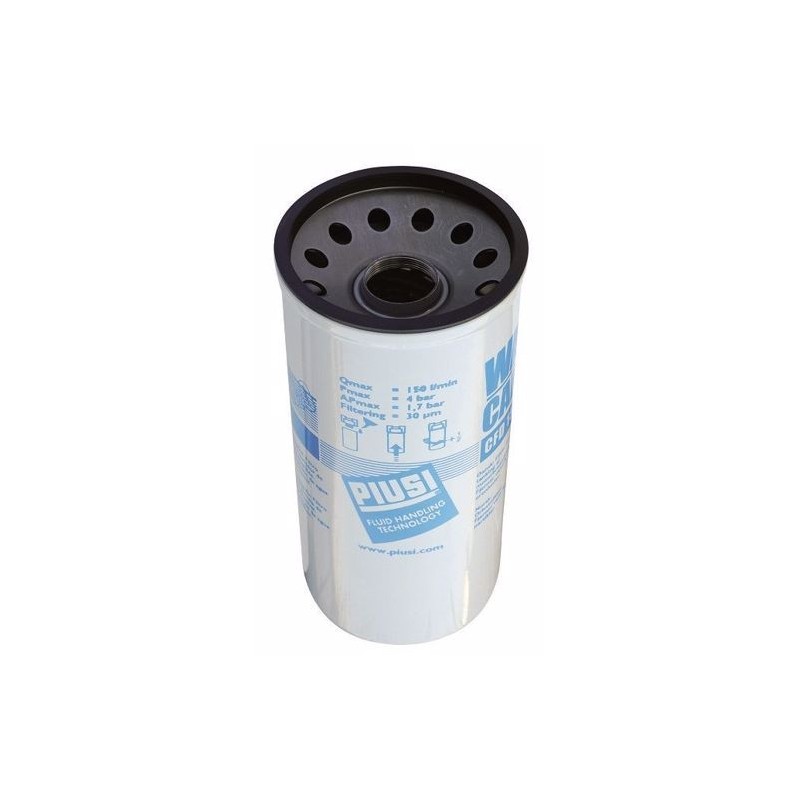 Filtro a cartuccia con funzione separatore d'acqua marca Piusi. Per rimuovere tracce d'acqua dal gasolio proteggendo motori e iniettori.