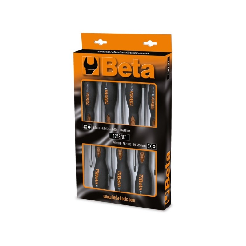 Serie assortita di giraviti (cacciaviti) professionali Beta, fornita in pratico supporto per organizzazione in officina. Ogni giravite è realizzato con lama in acciaio al cromo-molibdeno-vanadio brunita e impugnatura ergonomica bimateriale antiscivolo. La serie comprende le misure e i profili più utilizzati per coprire la maggior parte delle esigenze di avvitatura.