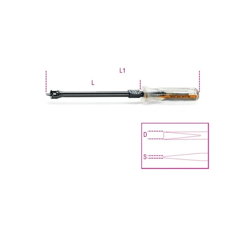 Utensile professionale Beta, marchio italiano di riferimento dal 1939 nella produzione di utensili manuali per l'industria, l'autoriparazione e la manutenzione. Costruzione in acciaio al cromo-vanadio con trattamento termico per garantire durezza, resistenza alla torsione e lunga durata nel tempo.