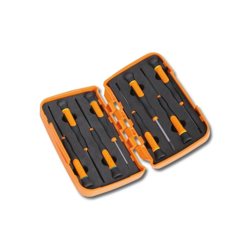 Serie assortita di giraviti (cacciaviti) professionali Beta, fornita in pratico supporto per organizzazione in officina. Ogni giravite è realizzato con lama in acciaio al cromo-molibdeno-vanadio brunita e impugnatura ergonomica bimateriale antiscivolo. La serie comprende le misure e i profili più utilizzati per coprire la maggior parte delle esigenze di avvitatura.
