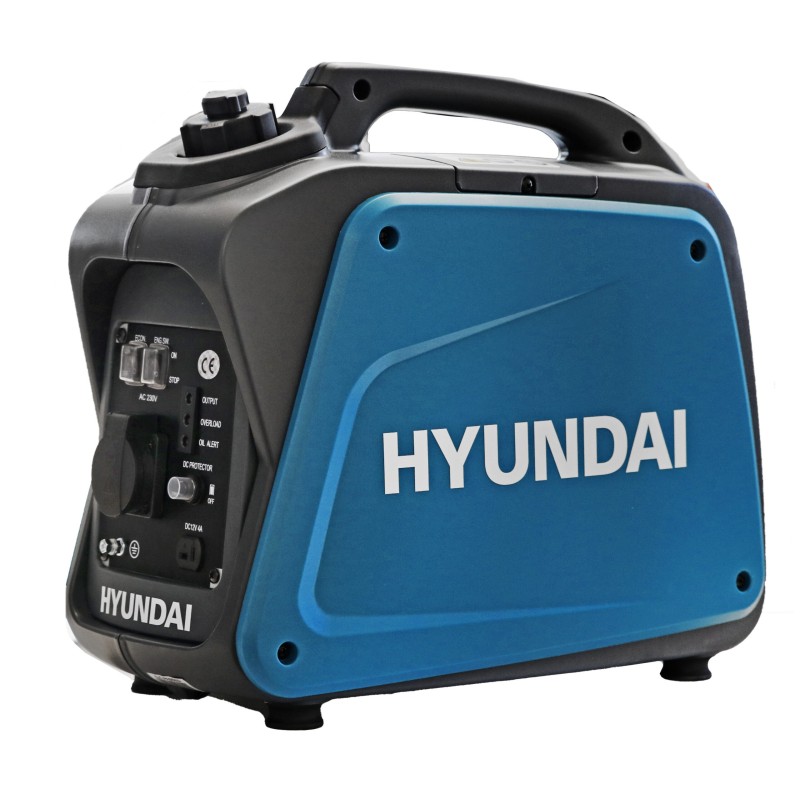 Generatore di corrente marca Hyundai con potenza 1,2KW. Avviamento manuale a strappo. Ultracompatto e leggero per trasporto facile.