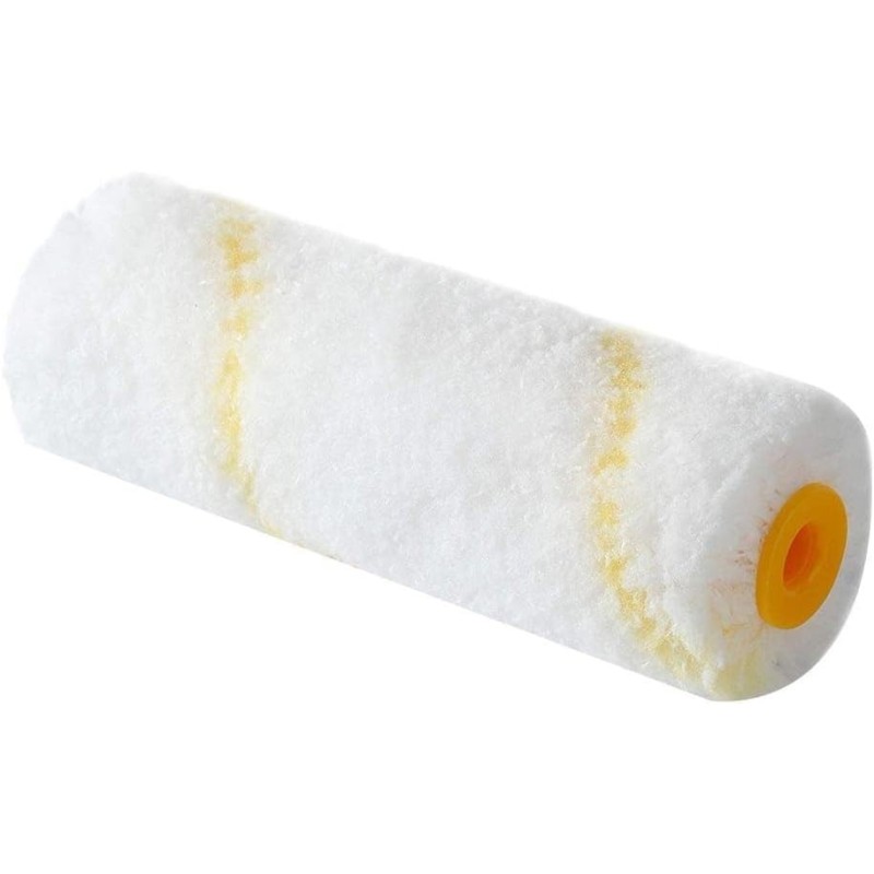 Mini rullo in tessuto cordonato bianco con riga gialla, adatto per dipingere qualsiasi tipo di superficie dal muro, al legno, al ferro.