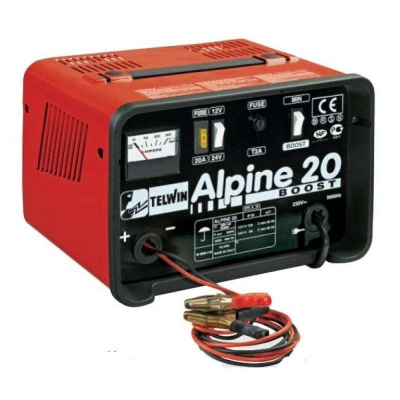 Caricabatterie portatile TELWIN Alpine 20 Boost per batterie ad elettrolita libero WET 12/24 V con selettore di carica normale o rapida (BOOST) e amperometro integrato. Protezione contro sovraccarichi e inversione di polarità, perfetto per garages, officine o uso hobbistico.