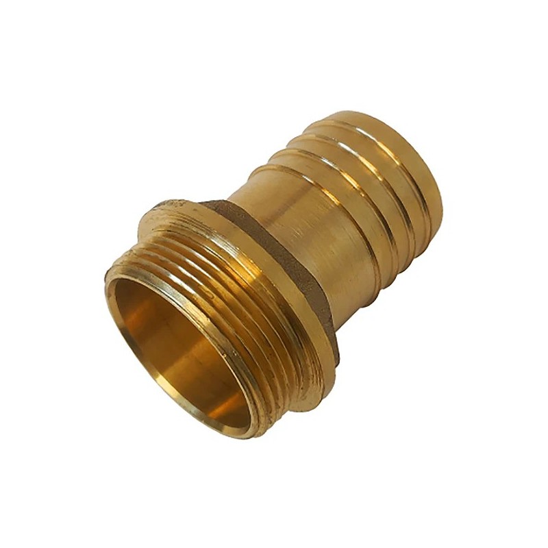 Raccordo in ottone con un lato portagomma e un lato filettato maschio per collegamento tubi flessibili.