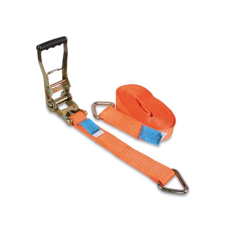 Cinghia di ancoraggio professionale con cricchetto per fissaggio carichi su veicoli.