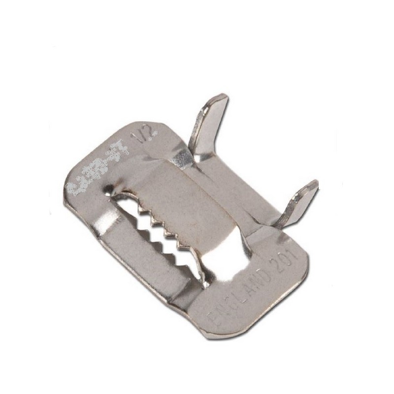 Fibbie in acciaio inox AISI 201 tipo Band-It marca Barbero in quattro misure (3/8", 1/2", 5/8", 3/4"), confezioni da 100 pezzi. Per chiusura reggetta inox Band-It della stessa larghezza.