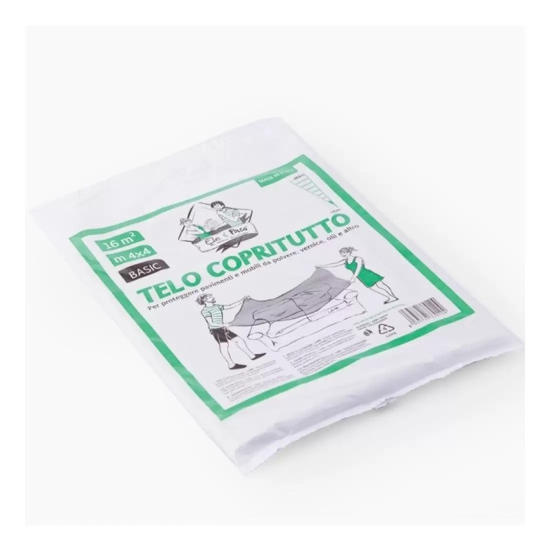 Teli in polietilene marca Elepacking 4x4 mt in due versioni: copritutto leggero (350 gr) per polvere e schizzi, cellophan pesante (1.500 gr) per coperture più resistenti.