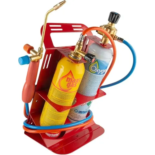 Kit saldatura autogena portatile Oxyturbo Turbo Set 90, temperatura fino a 3000°C. Completo di bombola ossigeno 1 lt, cartuccia Maxy Gas, impugnatura, lancia, stella a 4 punte, accessori. In carrello metallico.