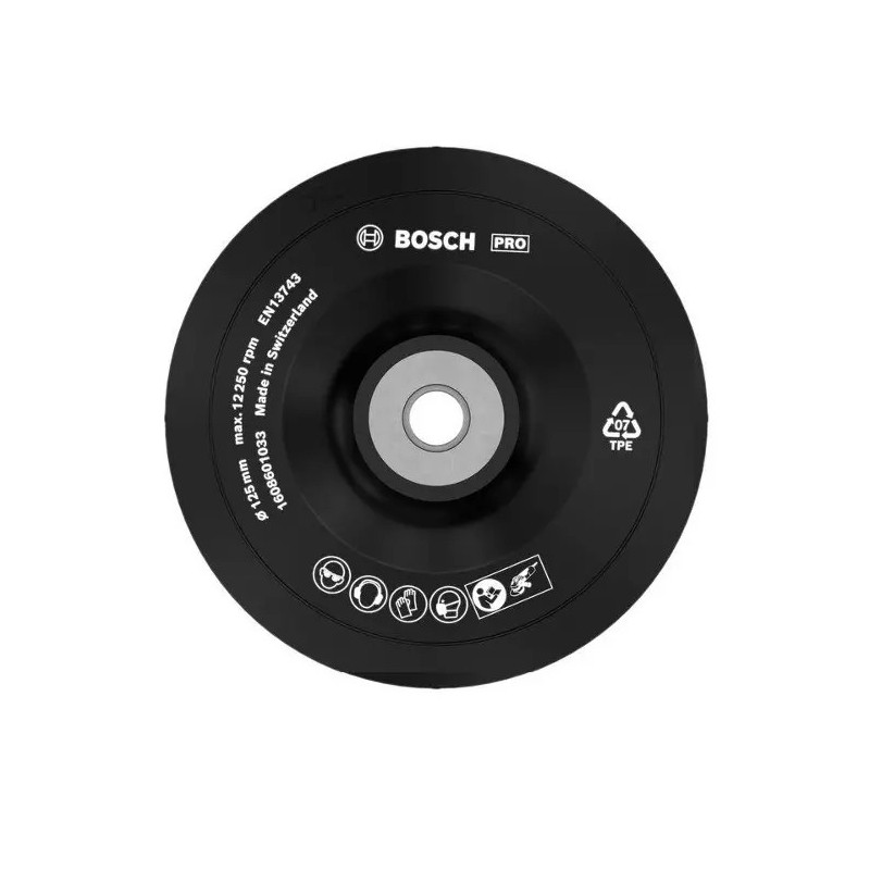 disco di supporto in gomma/rubber backing pad da 125 mm cod. 1608601033 con attacco filettato M14 per levigatrici angolari e applicazioni di carta abrasiva e fibrosa Bosch.