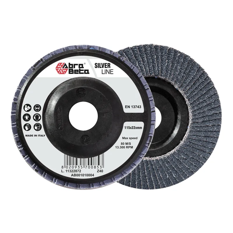 Disco lamellare Abra Beta linea Silver con supporto in nylon e tela in zirconio. Utilizzabile per operazioni su acciai inossidabili, metalli ferrosi e non ferrosi. La linea Silver garantisce un eccellente compromesso tra prezzo e qualità. Le grane più grosse sono indicate per lavori di smerigliatura e sgrossatura, le grane più fini per operazioni di finitura.