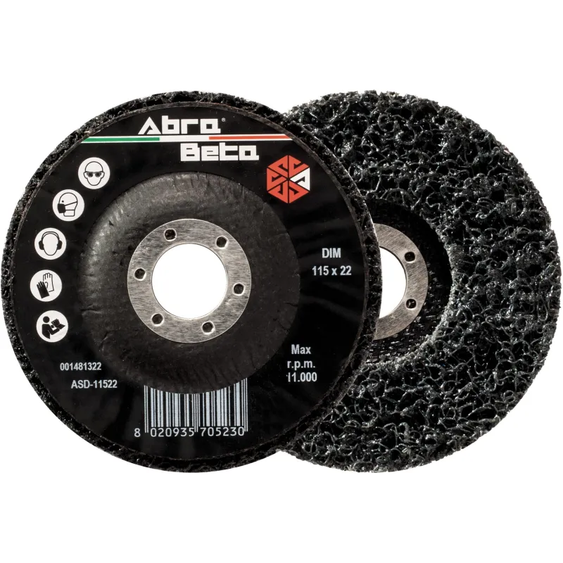Disco stripping Abra Beta per la rimozione rapida ed efficace di vernici, ossidi, ruggine e residui da superfici metalliche. La versione nera è studiata per un'azione aggressiva su vernici tenaci e strati di ossido pesanti.