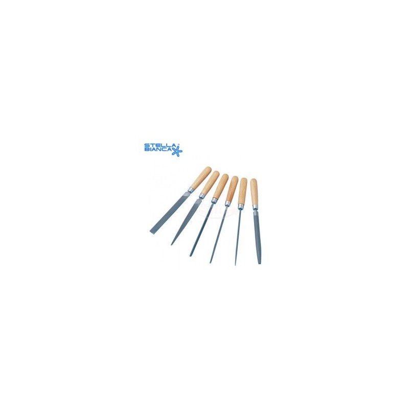 Set di 6 lime ad ago in acciaio speciale ad alto carbonio ~64 HRC, lunghezza 160mm, taglio 2 (semidolce). Le lime ad ago sono strumenti di precisione per rifinitura di superfici inaccessibili alle lime standard. Il set include 6 profili diversi.