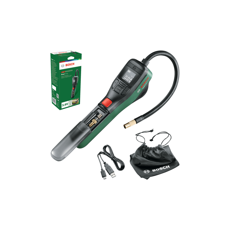 Bosch EasyPump 0603947000 è una pompa d’aria compatta e portatile con batteria interna agli ioni di litio e ricarica tramite USB‑C®, progettata per offrire una soluzione di gonfiaggio senza cavi. Include vari adattatori per valvole (ad esempio Presta e aghi per palloni) riponibili nel manico, un display per il monitoraggio della pressione e una luce LED integrata per visibilità durante l’uso. Ideale per pneumatici di veicoli leggeri, biciclette, palloni e piccoli oggetti sportivi.