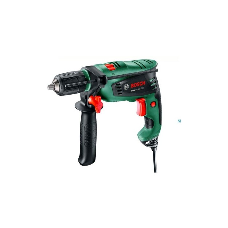 Trapano a percussione Bosch della linea Easy/Impact con motore da circa 550 W, mandrino autoserrante da 13 mm e regolazione elettronica della velocità. Utensile pensato per forare legno, calcestruzzo e metallo in progetti di bricolage e lavori domestici con comfort e controllo ergonomico.