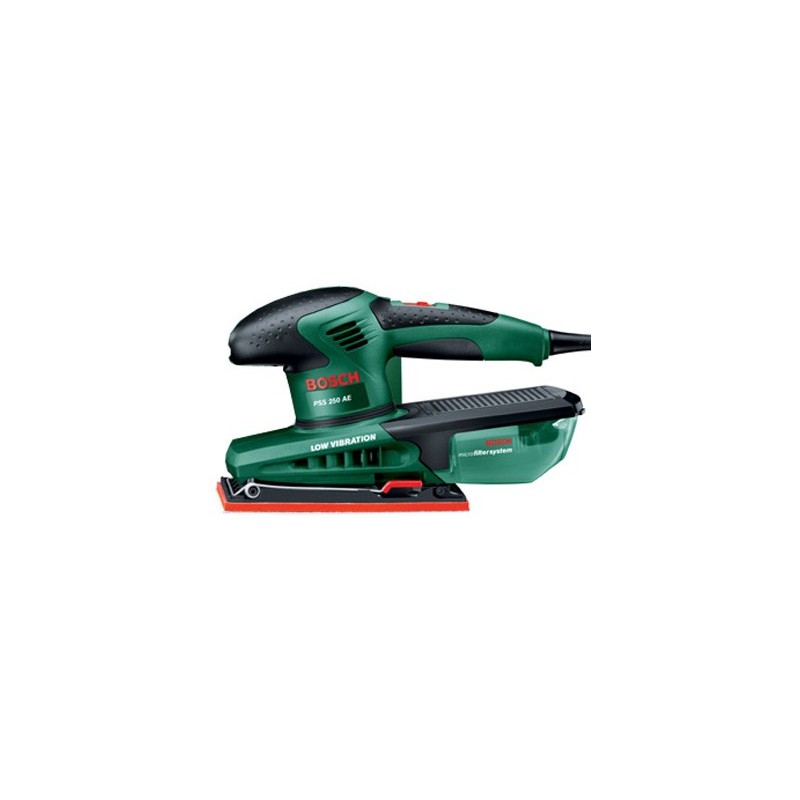 Levigatrice orbitale Bosch PSS 250AE con sistema Microfilter integrato e accessori per raccolta e filtrazione della polvere. Utensile elettrico versatile e confortevole per levigature fini su superfici piane di legno, metallo, vernice, intonaco e pietra.