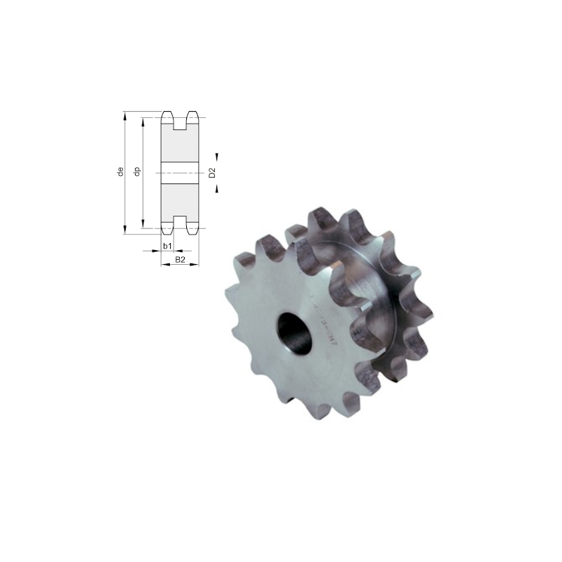 Pignone 1.1/2" doppio, ideale per trasmissioni che richiedono la rotazione simultanea di due catene con maggiore stabilità e affidabilità.