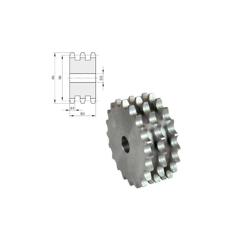 Pignone 3/4" triplo, ideale per trasmissioni che richiedono la rotazione simultanea di tre catene, garantendo stabilità e durata.