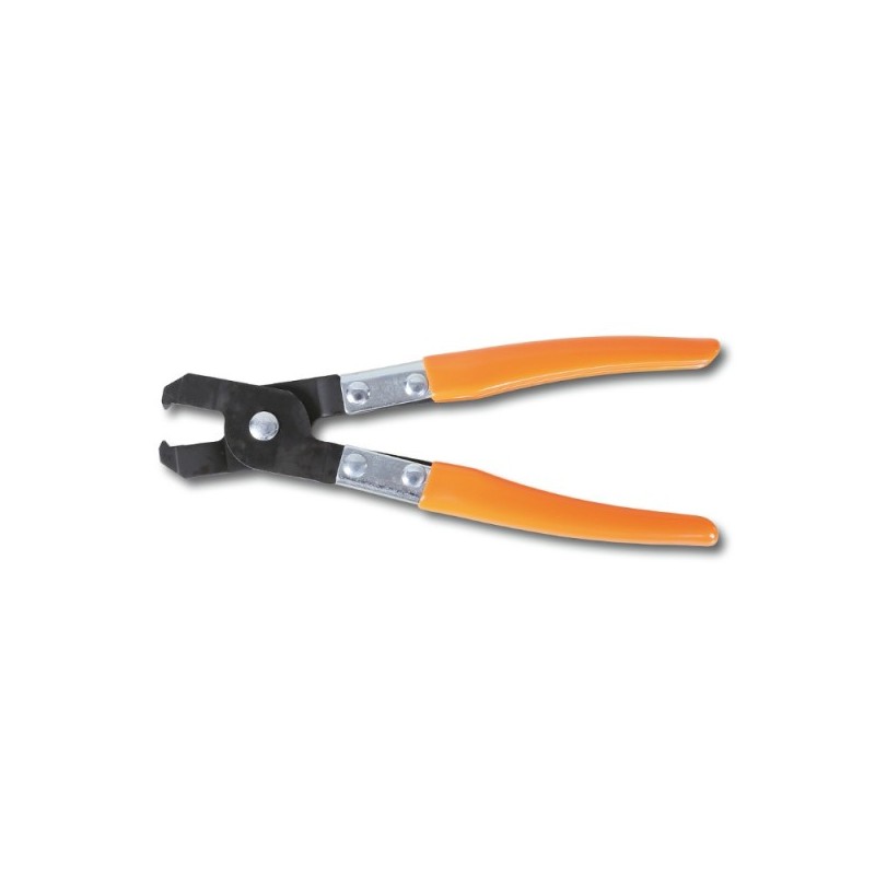 Pinza specialistica Beta per l'installazione e la rimozione di fascette stringitubo, collari Oetiker e fascette a molla su tubazioni di veicoli e impianti. Becchi sagomati per presa sicura sulle fascette senza danneggiarle. Costruzione in acciaio al cromo-vanadio con impugnatura bimateriale.