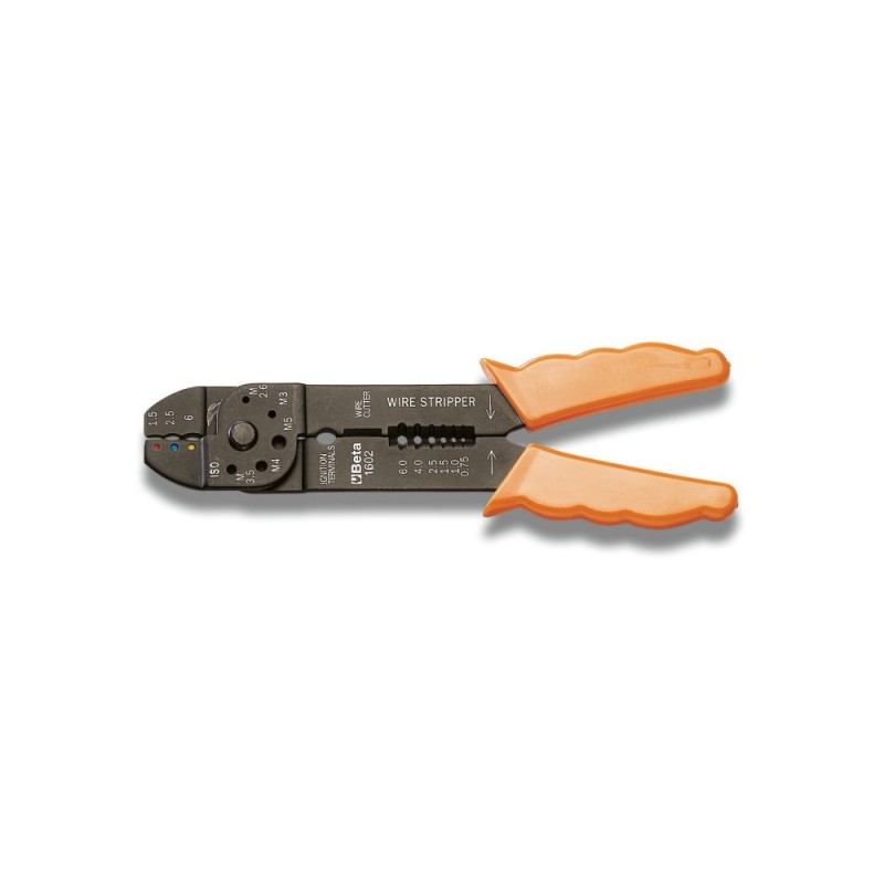 Pinza crimpatrice professionale Beta per la compressione di capicorda, terminali e connettori su cavi elettrici. Matrici di pressatura calibrate per crimpatura conforme agli standard di qualità. Meccanismo a doppia articolazione per serraggio uniforme e minimo sforzo. Impugnatura bimateriale ergonomica.