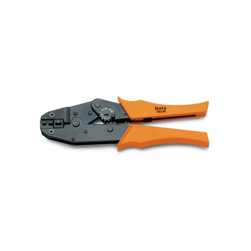 Pinza crimpatrice professionale Beta per la compressione di capicorda, terminali e connettori su cavi elettrici. Matrici di pressatura calibrate per crimpatura conforme agli standard di qualità. Meccanismo a doppia articolazione per serraggio uniforme e minimo sforzo. Impugnatura bimateriale ergonomica.