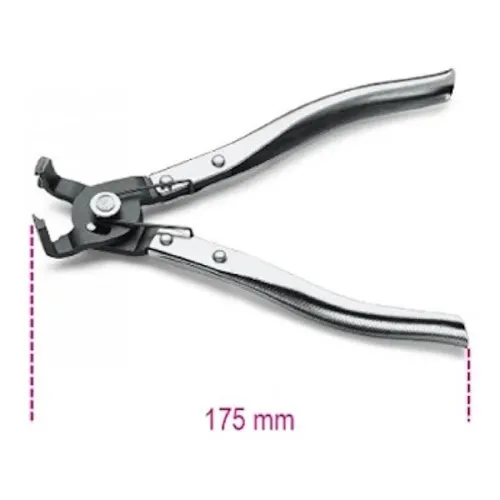 Pinza specialistica Beta per l'installazione e la rimozione di fascette stringitubo, collari Oetiker e fascette a molla su tubazioni di veicoli e impianti. Becchi sagomati per presa sicura sulle fascette senza danneggiarle. Costruzione in acciaio al cromo-vanadio con impugnatura bimateriale.