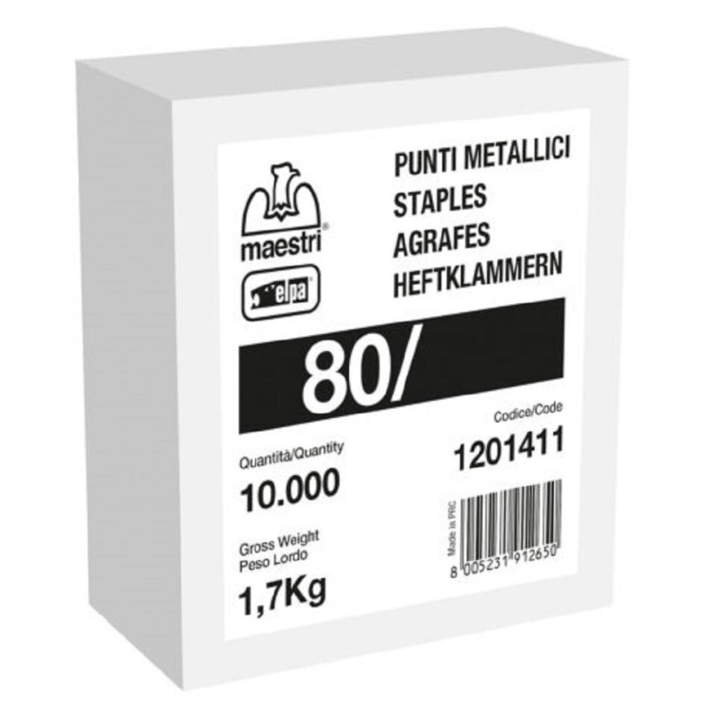 Punti metallici serie 80 marca Barbero in confezioni da 10.000 pezzi nelle lunghezze 6, 8, 10, 12 e 14 mm. Corona larga per chiusura casse, fissaggio coperchi e imballaggi industriali.