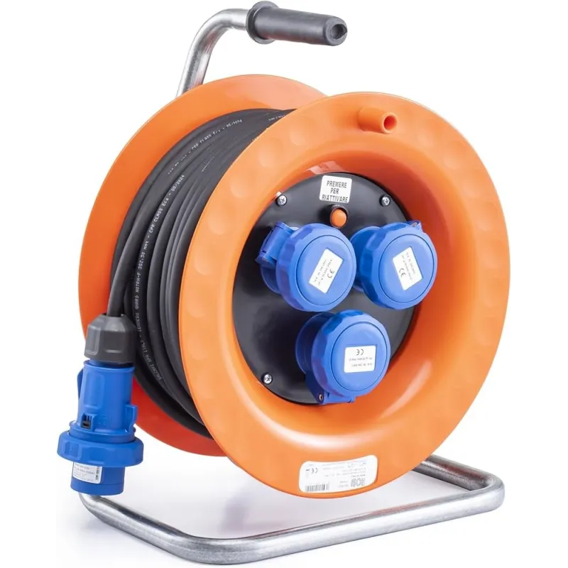 Prolunga elettrica/avvolgicavo per l'alimentazione di utensili e apparecchiature in cantiere, officina e ambienti domestici. Cavo in PVC/gomma di sezione adeguata per portate elevate, con protezione termica integrata.