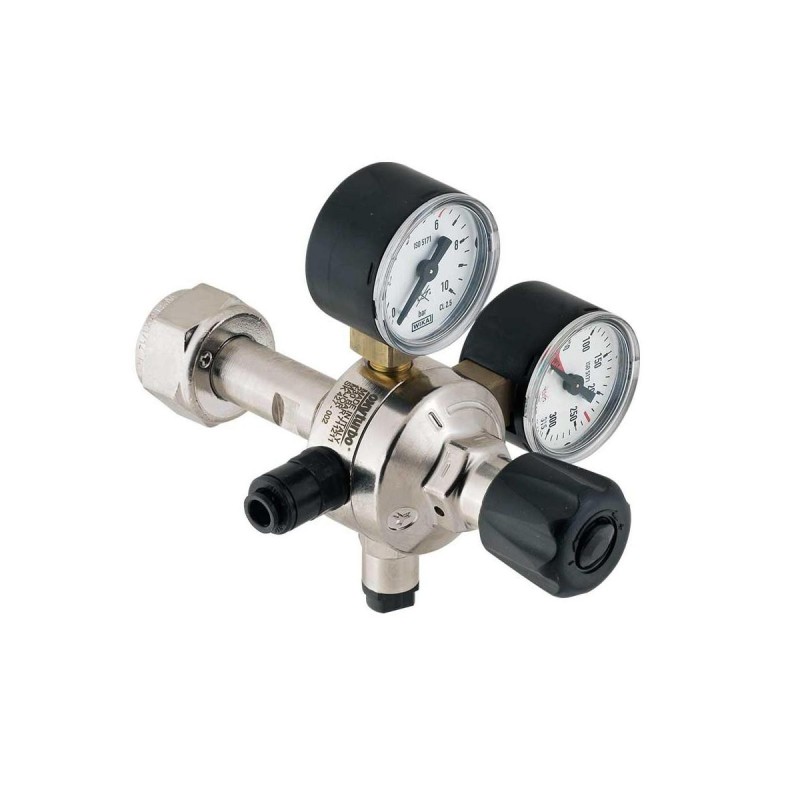 Riduttore di pressione per bombole a perdere CO₂ con attacco 10×1, completo di 2 manometri per monitorare pressione della bombola e pressione regolata in uscita.