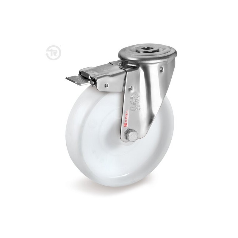 Ruota in nylon D.125mm con supporto inox fisso e freno a pedale.