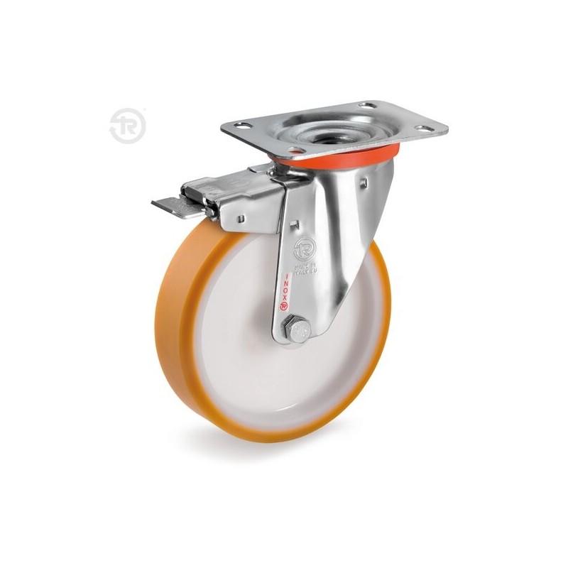 Ruota in poliuretano con supporto inox girevole e freno a pedale. 4 misure.