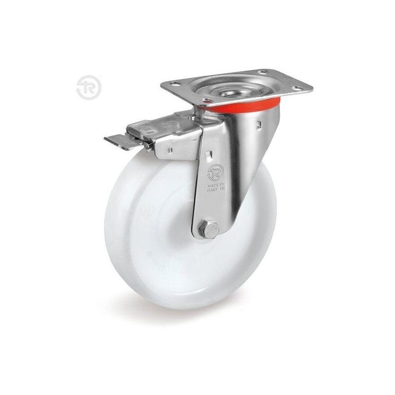 Ruota nylon supporto girevole con freno D.100 Tellure Rota. Con freno a pedale per blocco posizione.