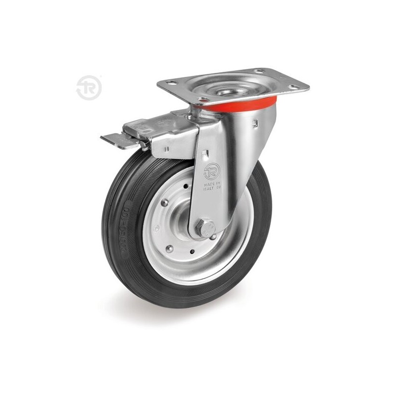 RUOTA GOMMA PIASTRA GIREVOLE CON FRENO TELLURE ROTA — 6 MISURE, DA D.80 A D.200MM