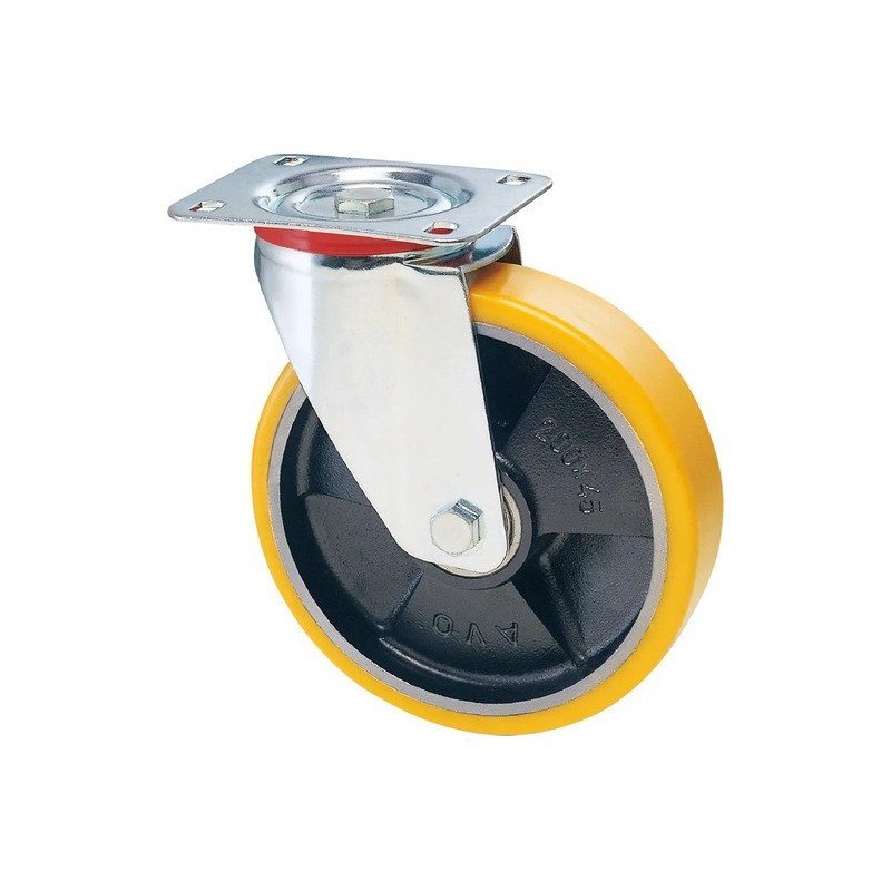Ruota in poliuretano con nucleo ghisa, supporto girevole e freno a pedale. D.80mm.