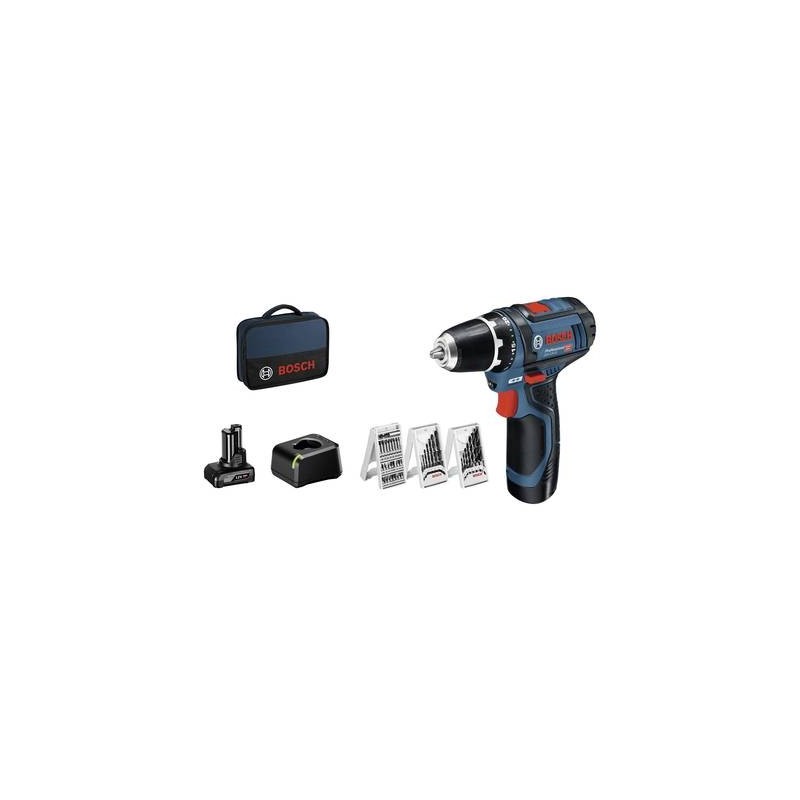 Set professionale che include il trapano‑avvitatore Bosch GSR 12V‑15 Professional con due batterie al litio (1×2,0 Ah e 1×4,0 Ah), caricabatterie 12 V e un set di accessori da 39 pezzi in borsa da artigiano, pensato per lavori di foratura e avvitamento su legno, metallo e materiali comuni. Utensile compatto ed ergonomico ideale per uso quotidiano, fai‑da‑te avanzato e professionale leggero.